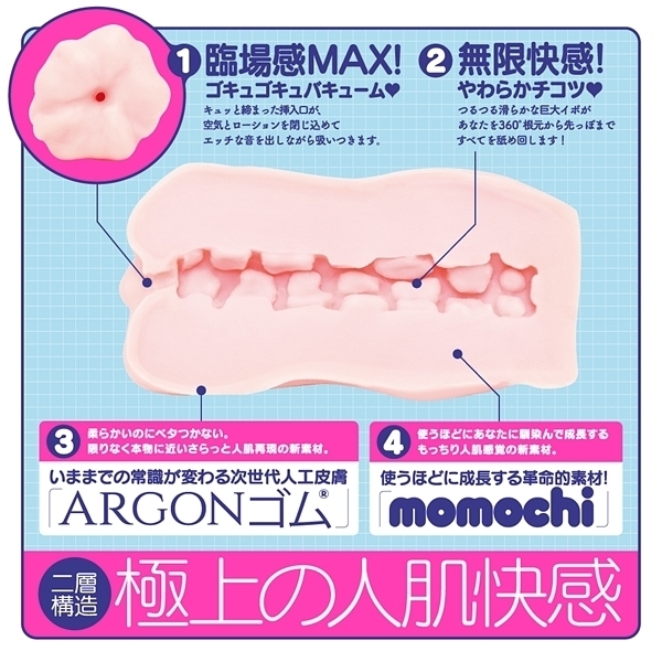 限りなく本物の肌と質感を追求した次世代人工皮膚素材を使用!いままでの常識が変わる次世代人工皮膚素材「ARGON(アルゴン)」を使用した非貫通オナホ「次世代HOLE XYZ 人工皮膚」です♪計算された内部構造にローションと空気の黄金比!極上の「ギュポギュポ」する吸い付きと挿れ心地は絶品です♪外層は柔らかいのにベタつかないさらっとした人肌再現の新素材を使用!内層は使うほどに成長する革命的素材「momochi」を使用することで、使えば使うほどにあなたに馴染んで成長するもっちり人肌感覚がたまりません♪劣化しずらい高い耐久性や弾力性も魅力的!2層構造が極上の人肌快感とキュッと締まった挿入口、そしてストロークの度にエッチなギュポ音を発する使用感が聴覚からもイキを誘発してくれそうです♪素材は安心の国産素材&国内生産。パッケージイラストは人気絵師「ぴょん吉」氏を起用。