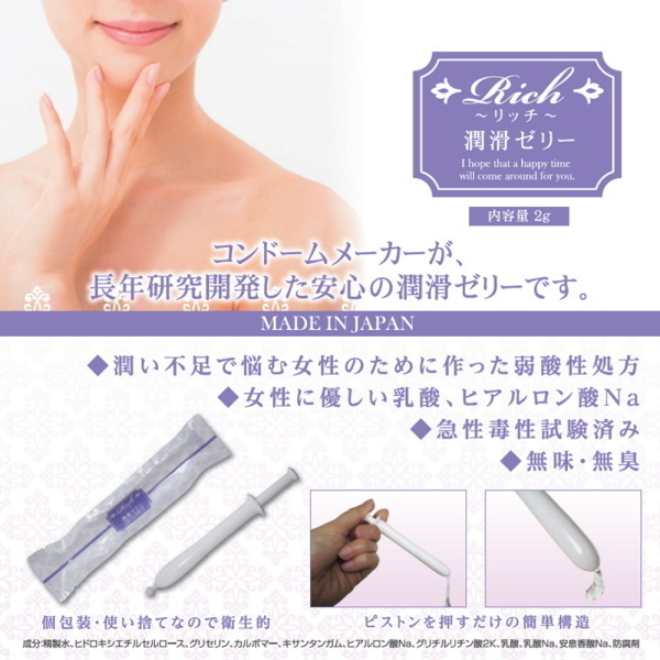 コンドームメーカーが長年研究開発した潤滑ゼリー!潤い不足で悩む女性のために作った弱酸性処方で女性に優しい乳酸、ヒアルロン酸Na。注射器型のワンタッチで手を汚さず衛生的です。